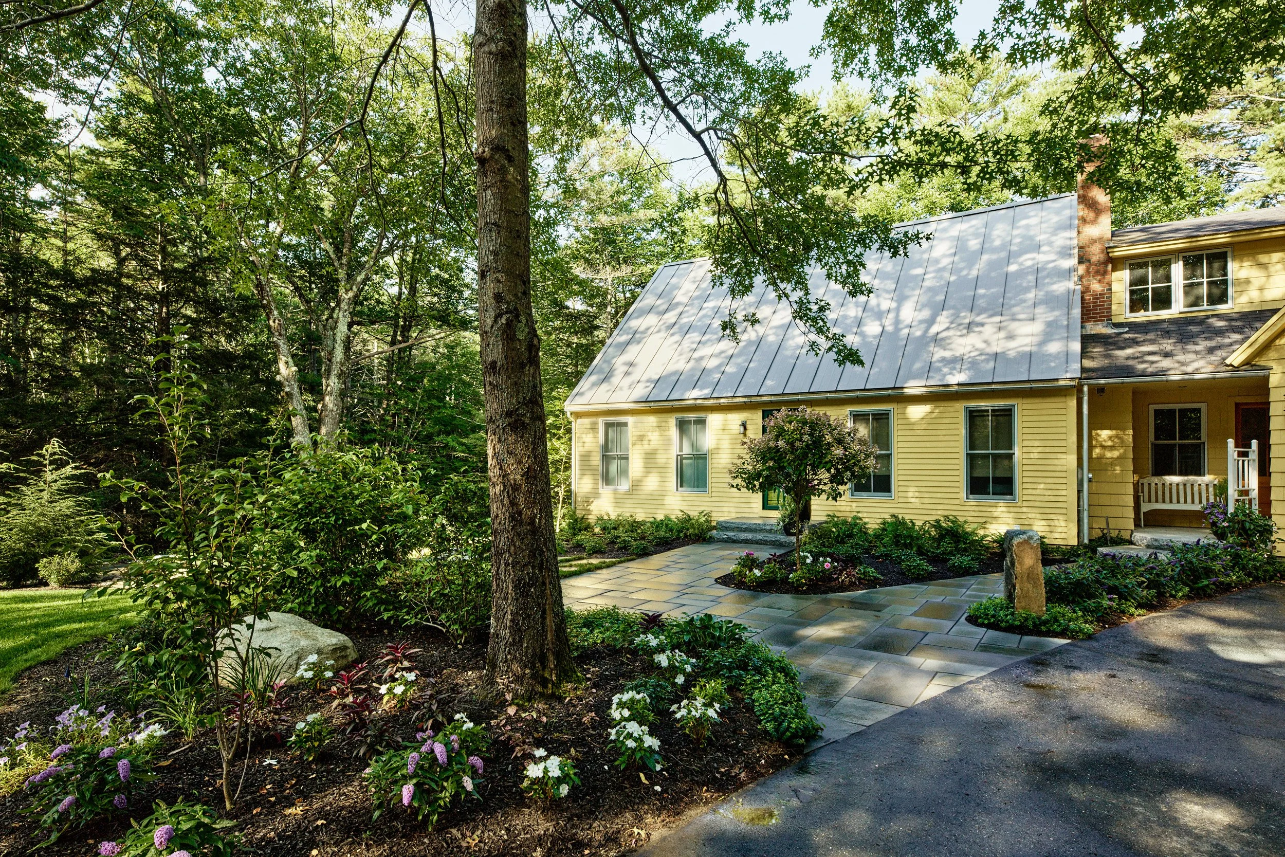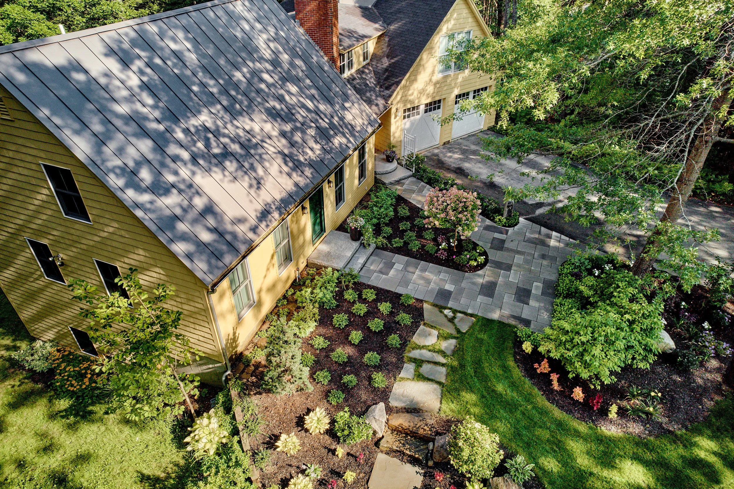 This Falmouth residence is nestled at the end of the street and the rear of the house backs onto acres of forested land. Because of the steep grade change from the front to the back of the property, it was determined that the best location for an outdoor sitting area was a portion of the front yard that was on the edge of the woods. The stone stairs lead down to a granite bridge that traverses a dry stream bed. There is a year-round stream within earshot of the property that contributes to the ambience of the setting. The front walkway was created using bluestone pattern pavers. The seating area was created using natural-cleft bluestone flagging.