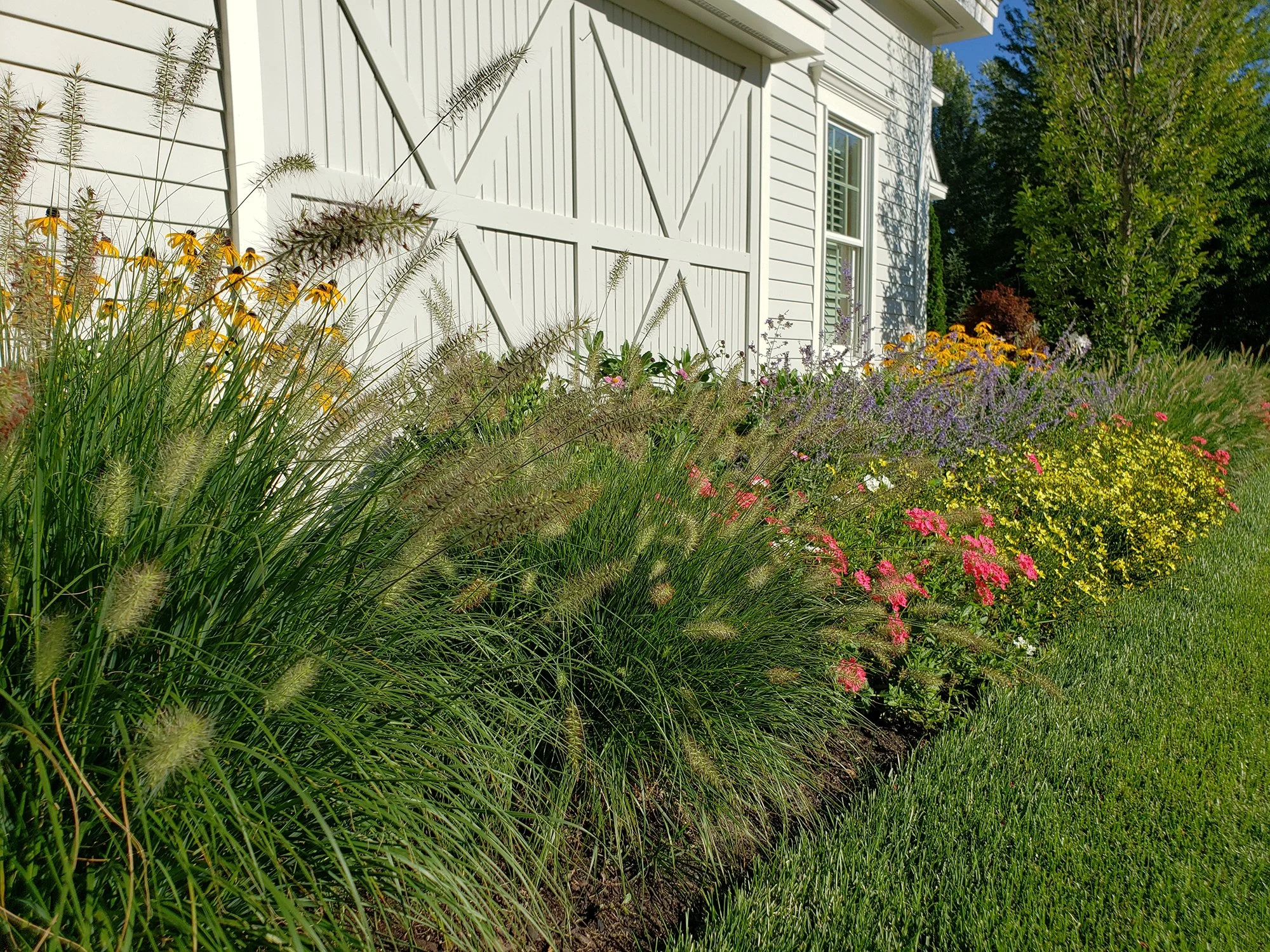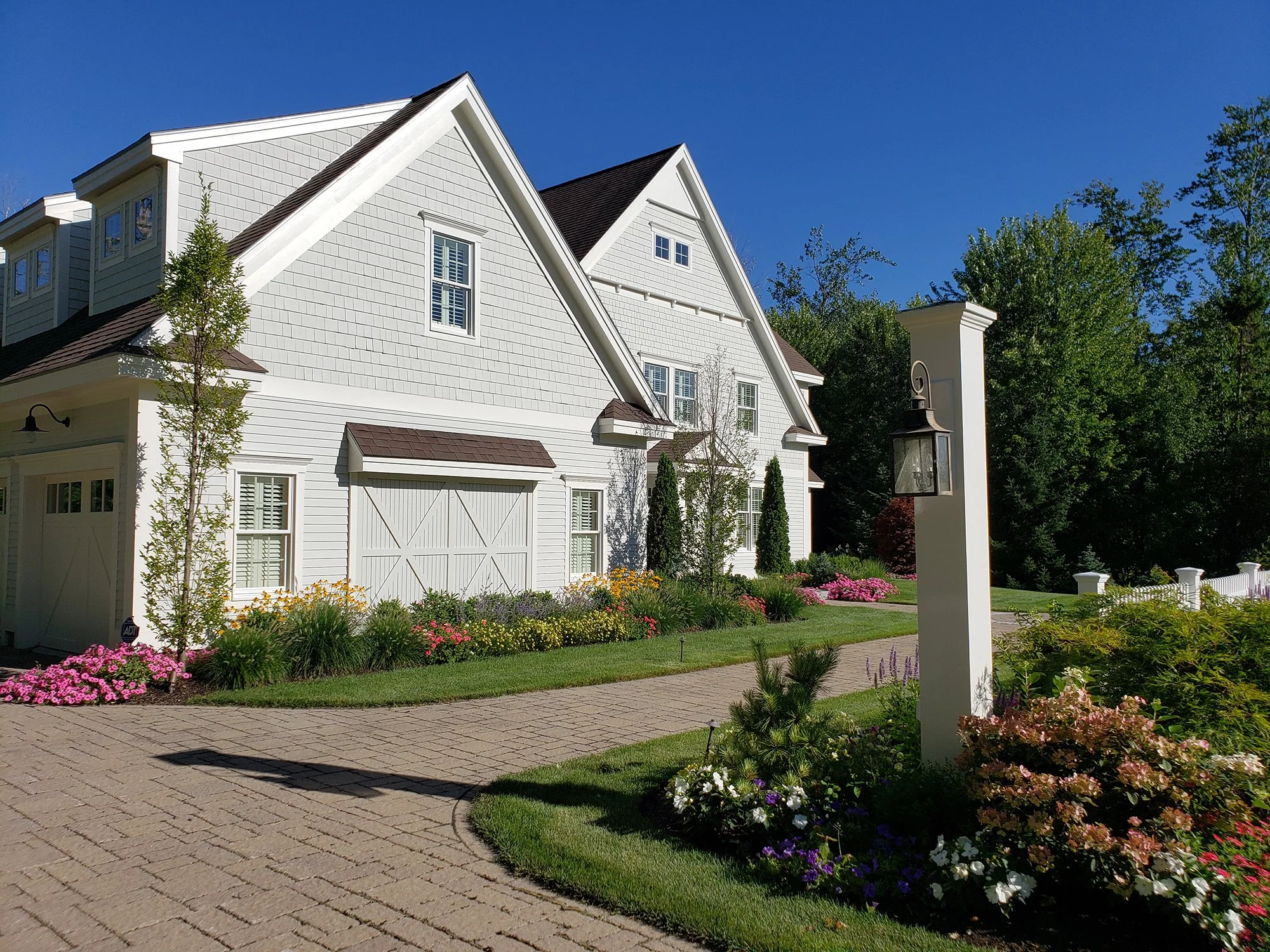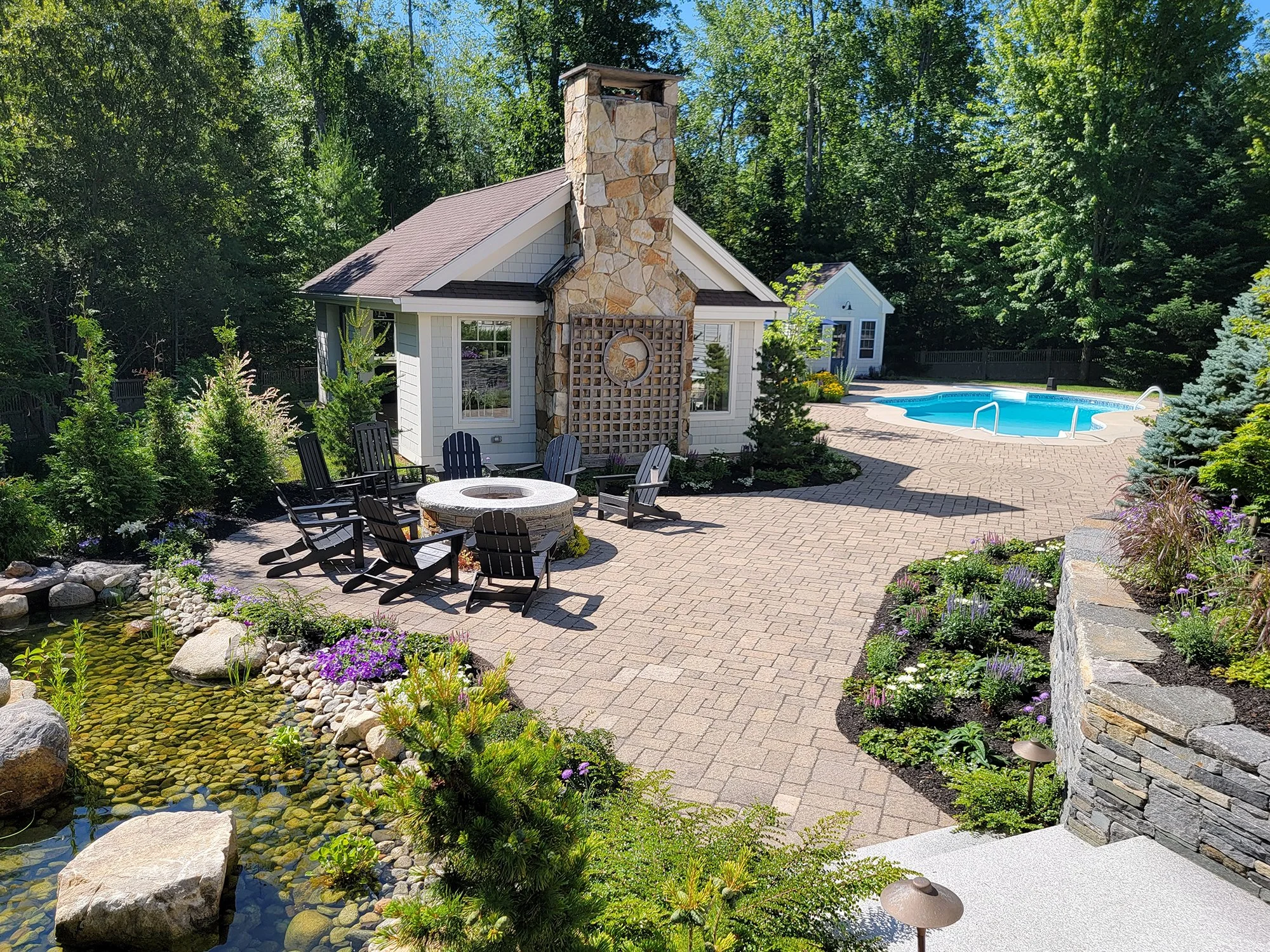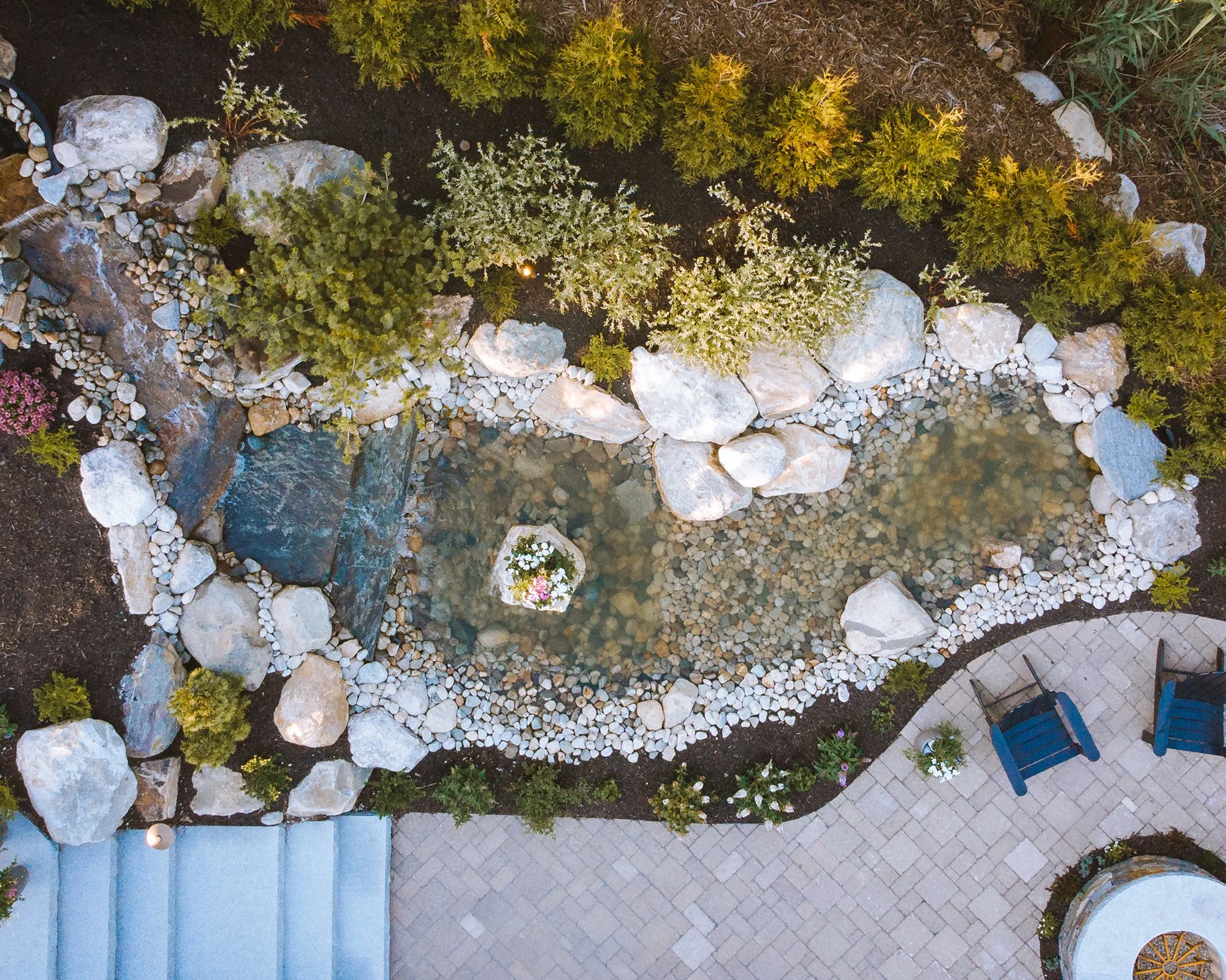 When Ted Carter Inspired Landscapes (TCIL) was engaged for this project, there were already significant amounts of hardscaping in place on the property, including walkways, terraces, stairs, a fire pit, and water feature. The homeowners built an addition onto the back corner of the house and TCIL was tasked with integrating the new addition with the landscape. The focal point for the landscape became the new water feature which is sited adjacent to the granite step staircase that provides access from the back porch to the back yard. In addition to the water feature, TCIL built a new fire pit, added a dry laid stone retaining wall, and formed garden bed spaces by removing portions of the existing pattern paver hardscape.